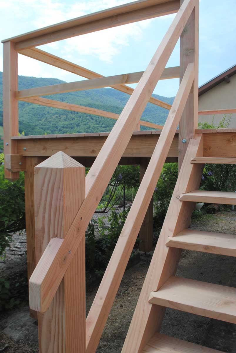 Création de la terrasse en douglas non traité, réalisation d'un escalier sur mesure façon échelle de meunier, et d'un garde-corps.