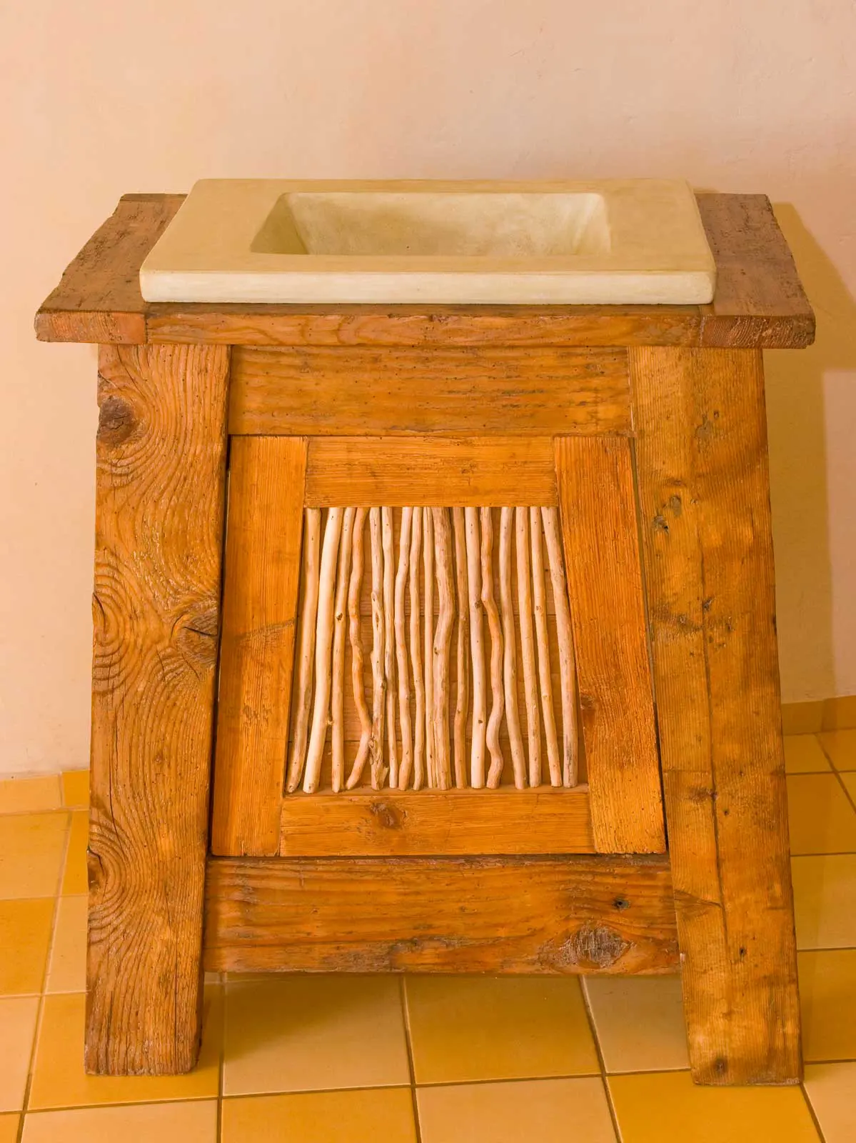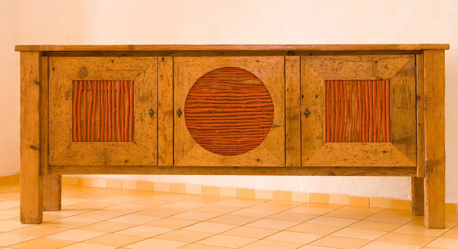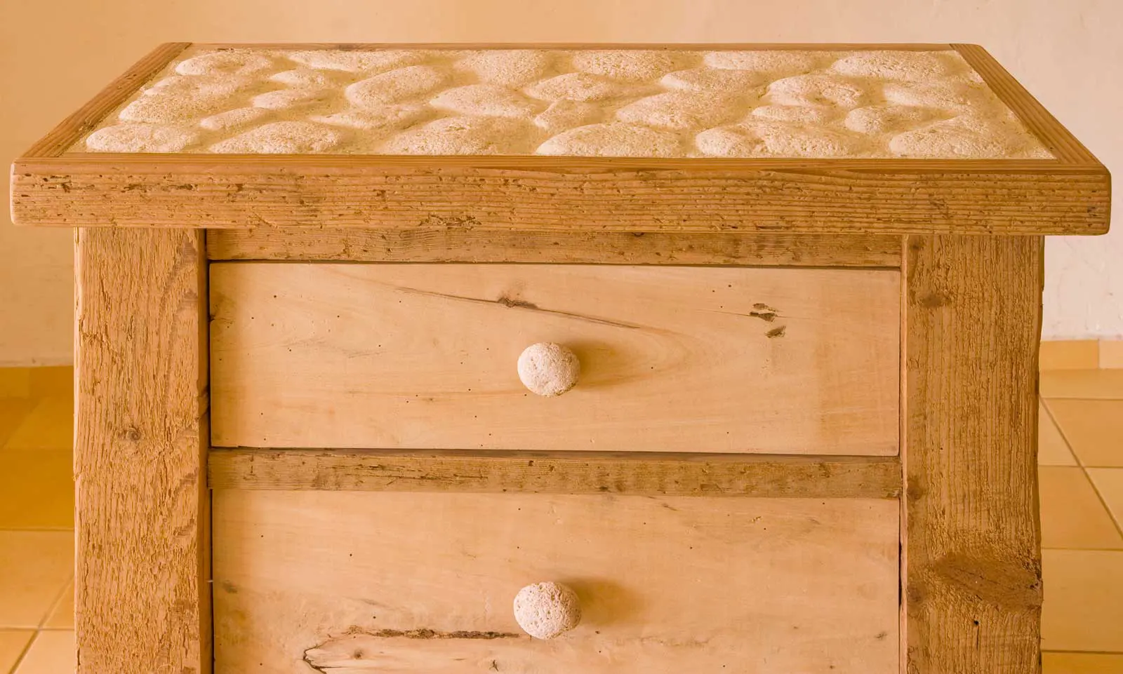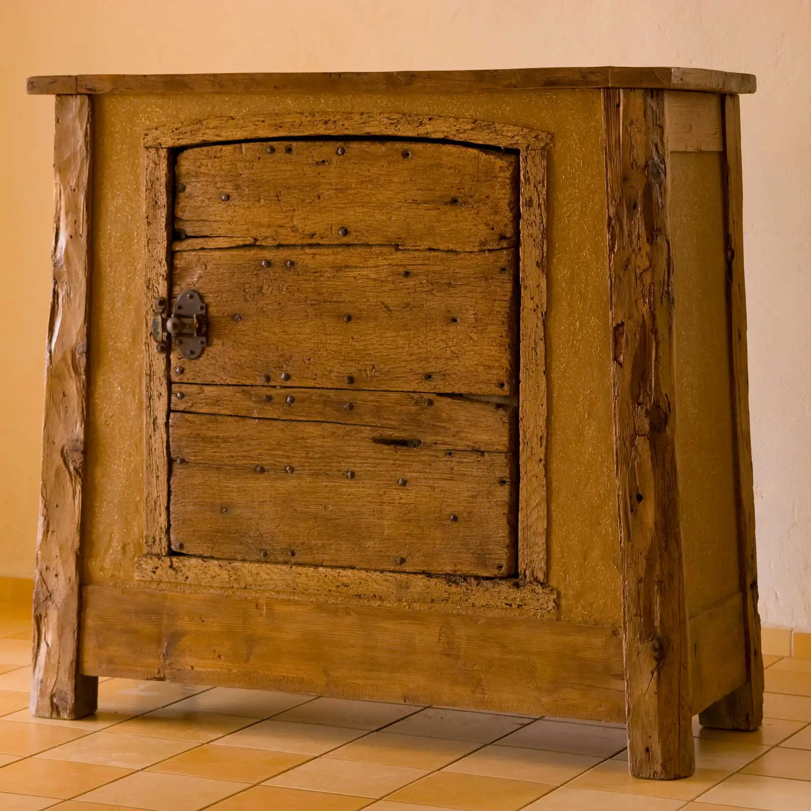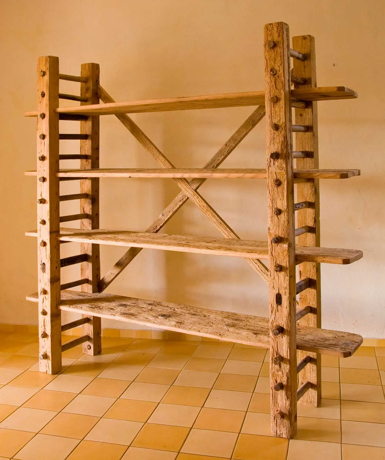 Rémy Charly crée ses meubles essentiellement à partir de matériaux de récupération : bois flotté, anciennes portes, volets, parquets récupérés, ferronneries. Il travaille également des matériaux durables : vasques en tadelakt, insert de galets, chaux…