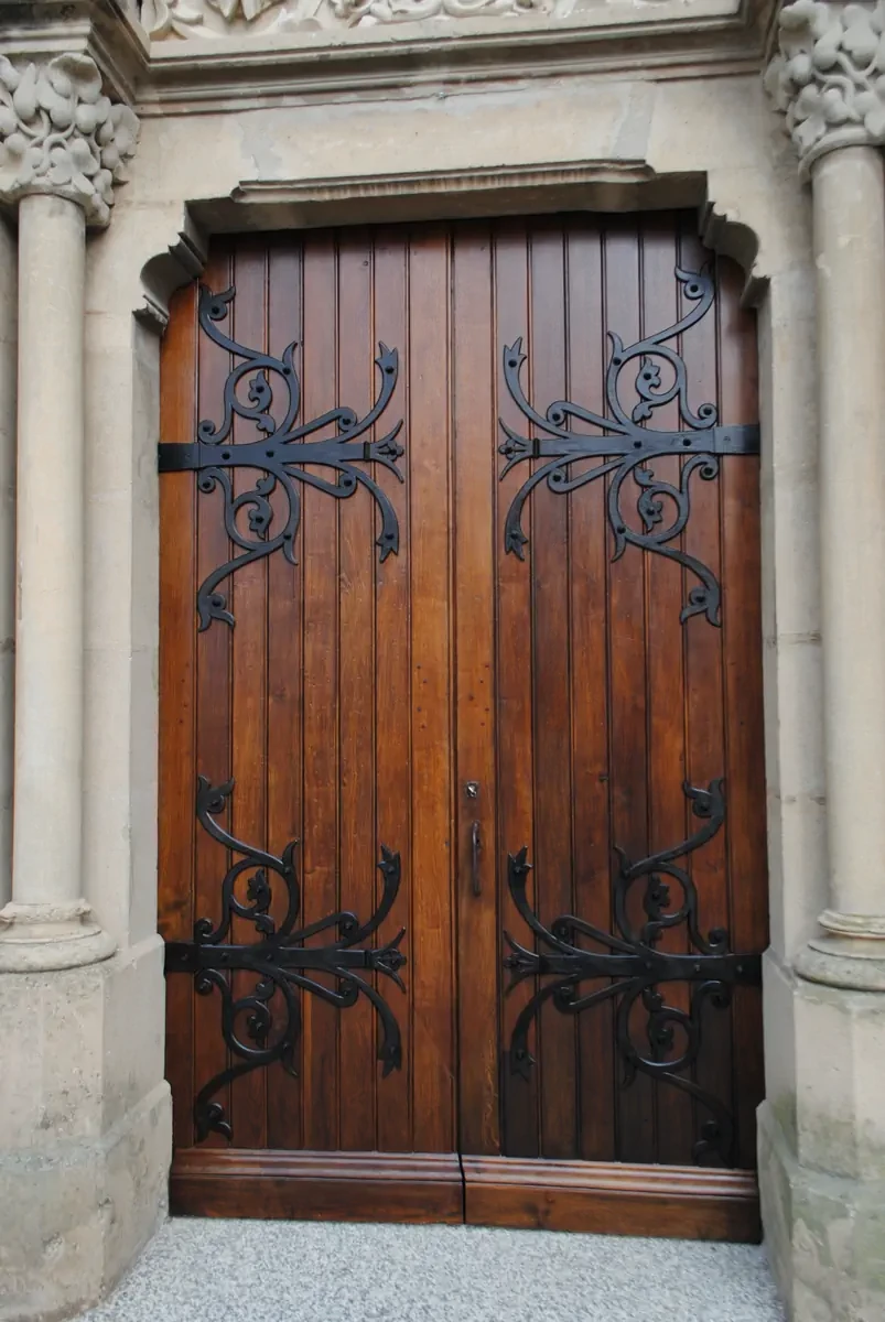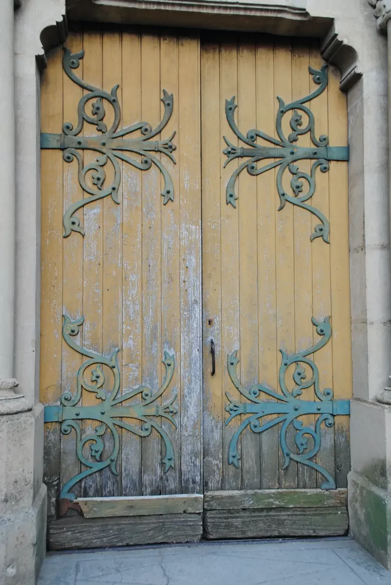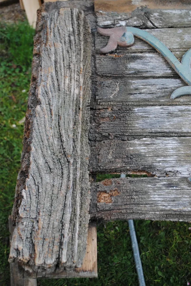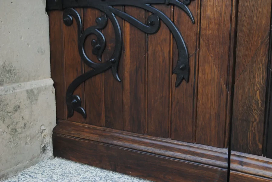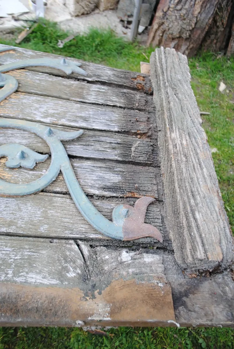 Une porte en chêne très abimée par le temps, l'usage et les intempéries. Dépose des portes. Démontage total de chaque porte, lame par lame. Ferrures brossées et repeintes. Enture sur chaque lame (rapiéçage de parties neuves pour remplacer les parties abimées), en tâchant de masquer les joints au maximum derrière les ferrures.