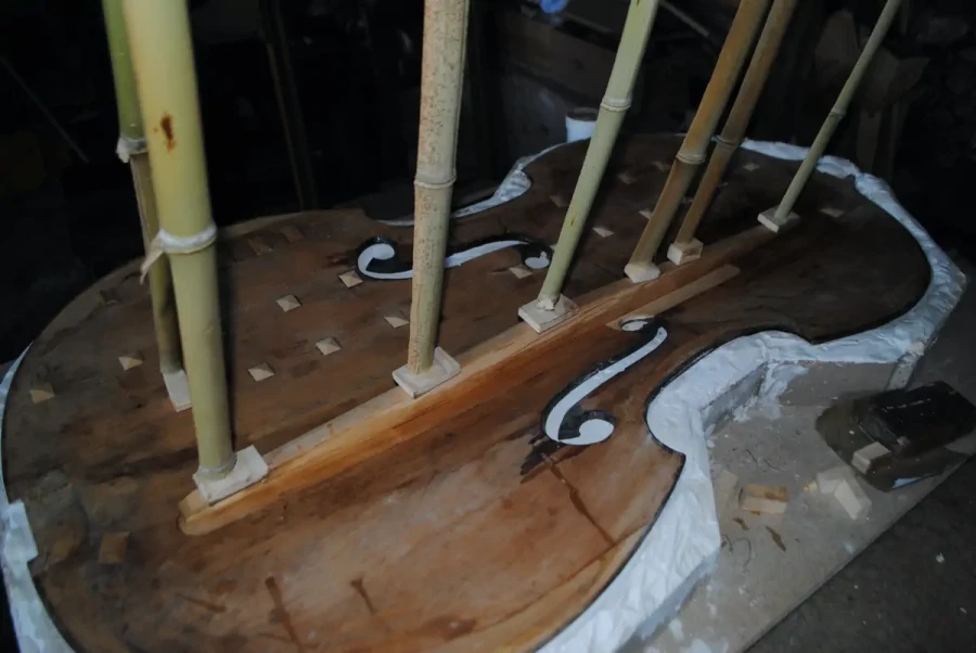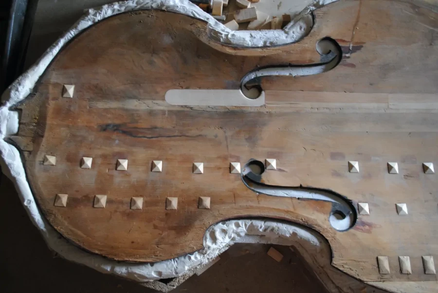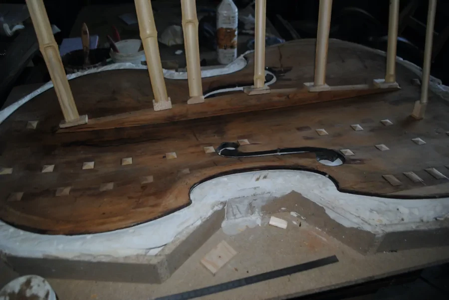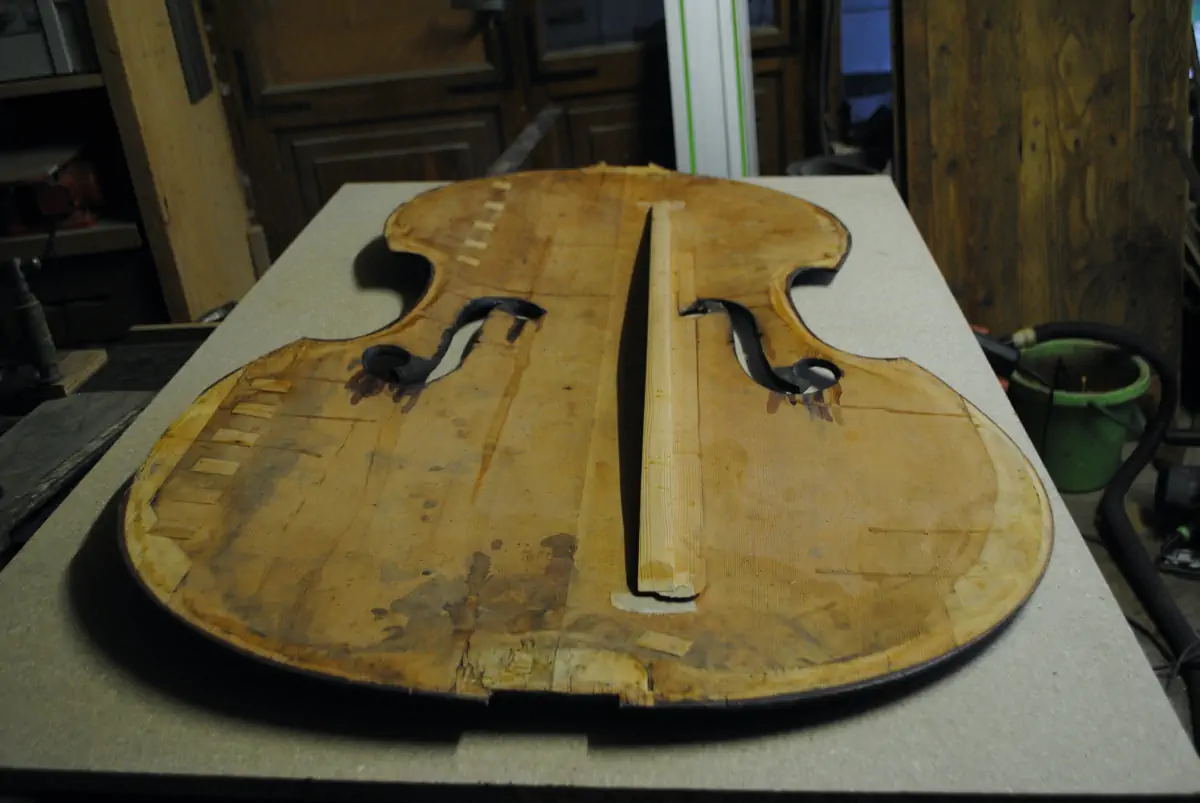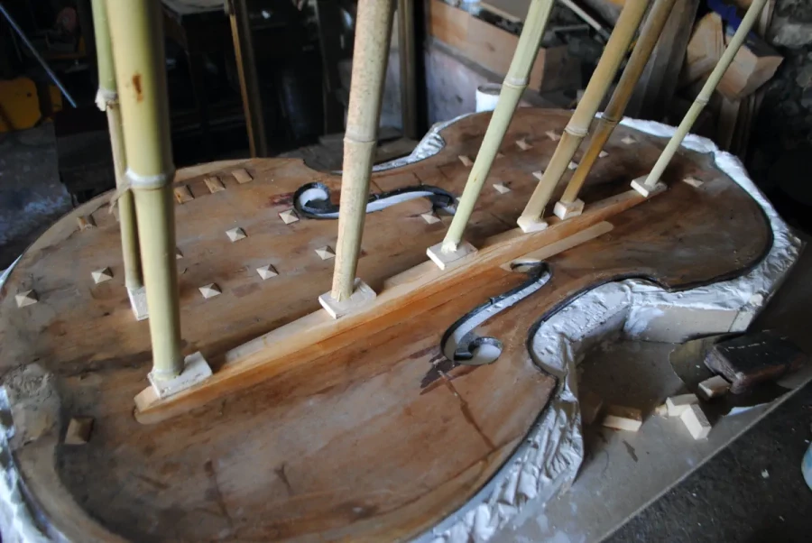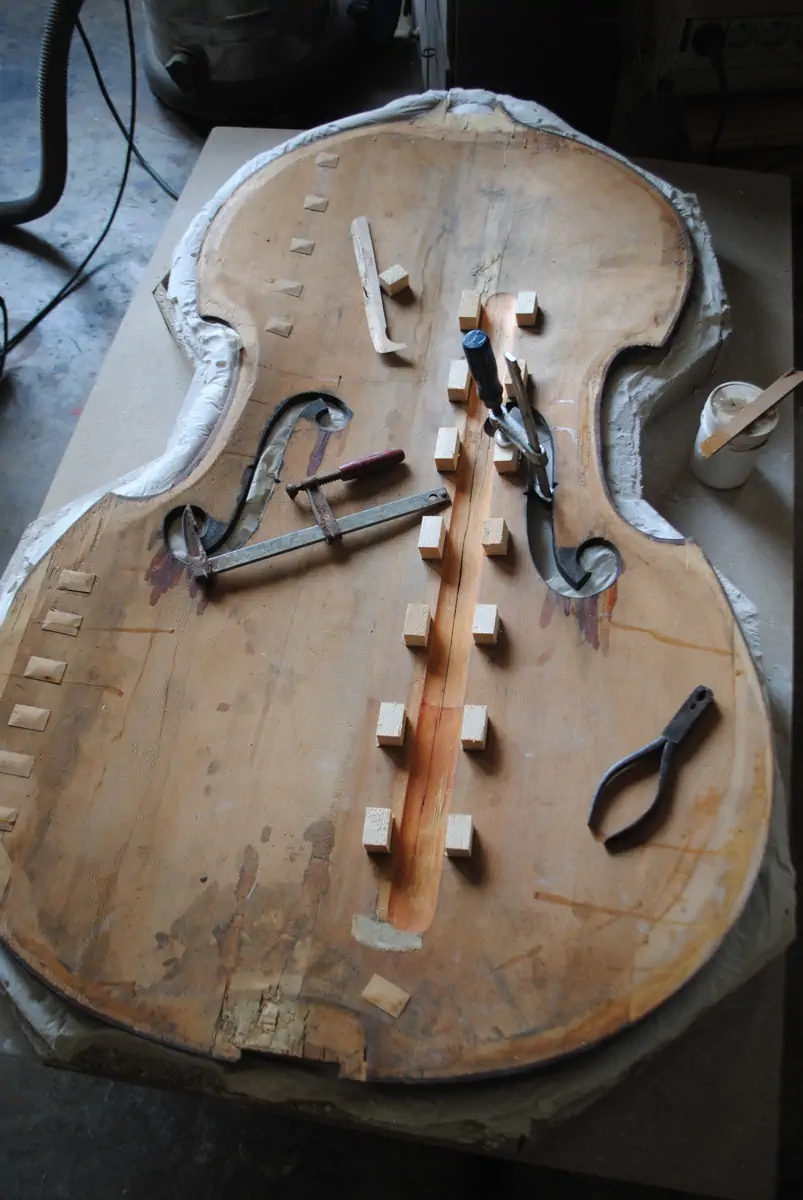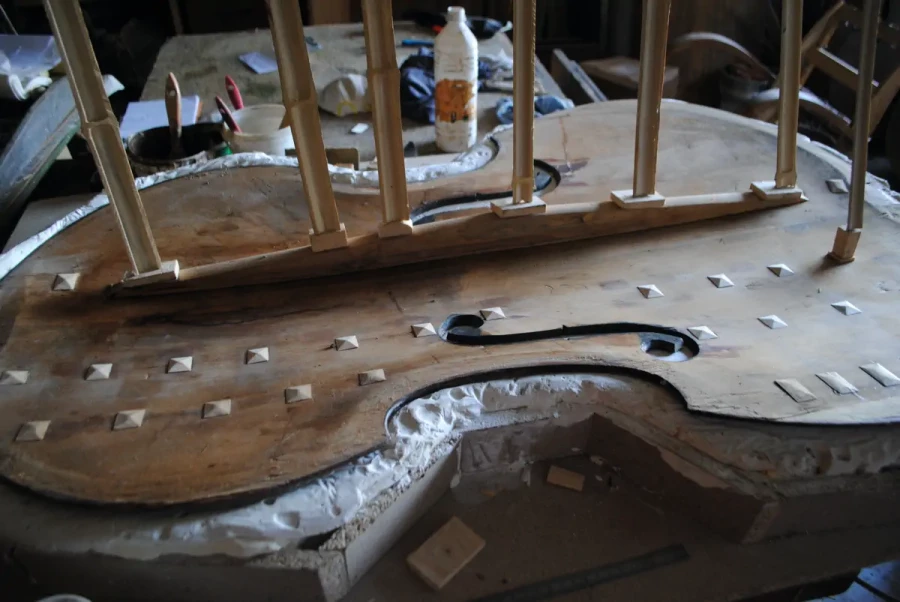 Mise sous presse de la table d'harmonie pour reformer sa courbe.