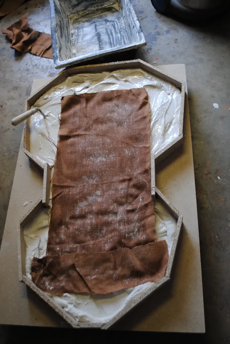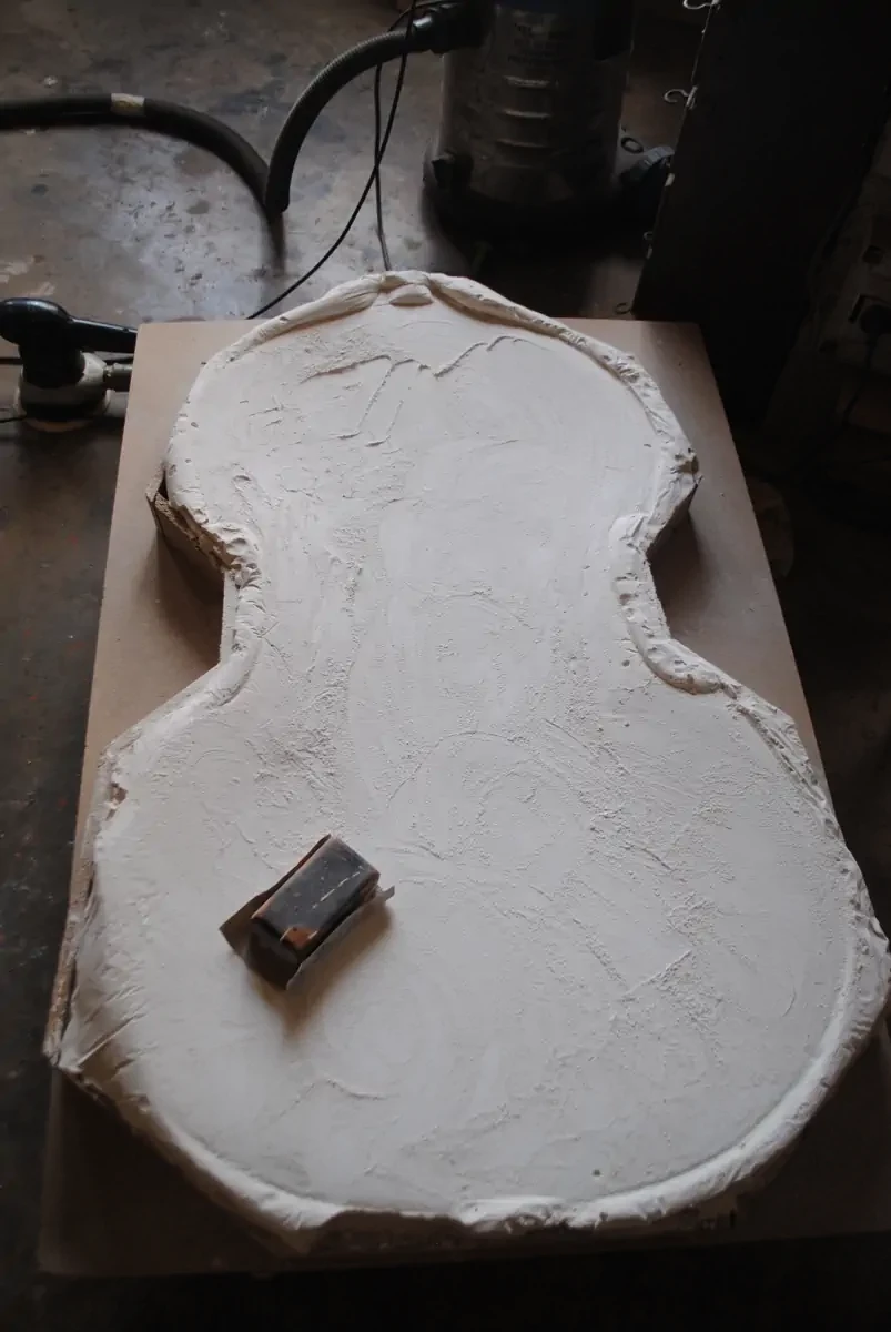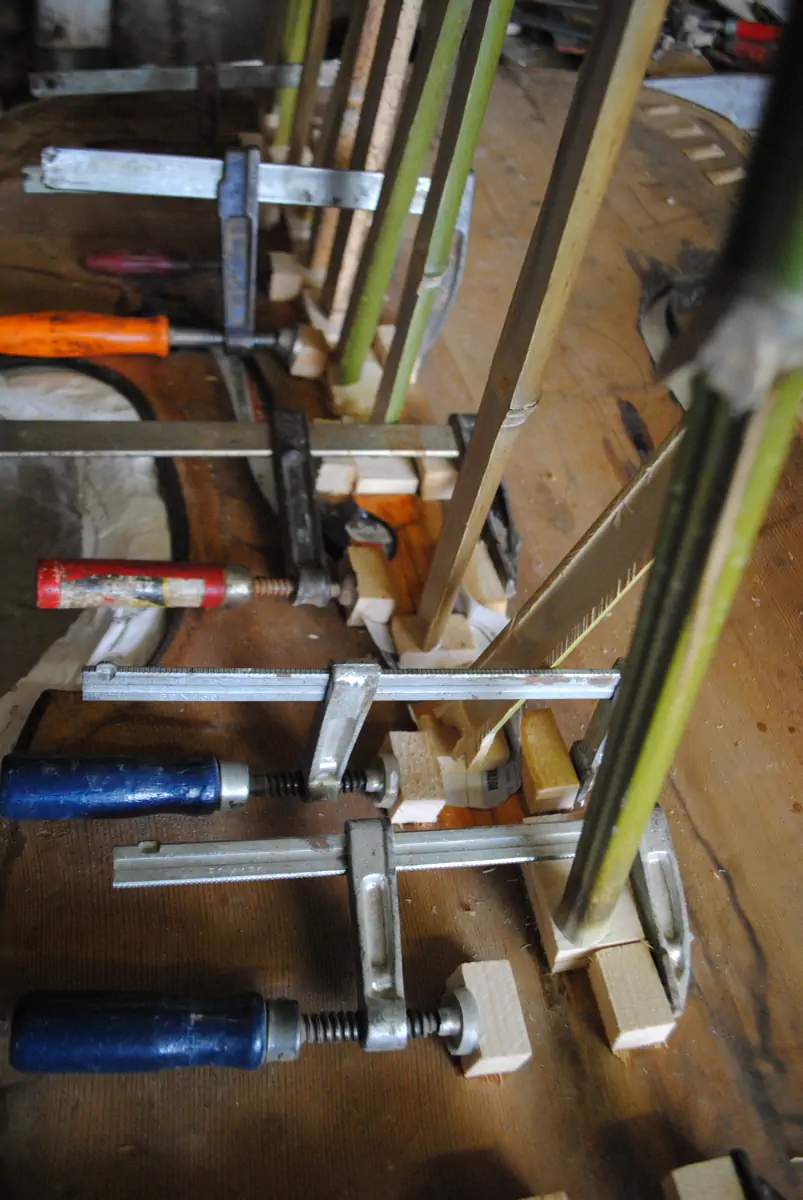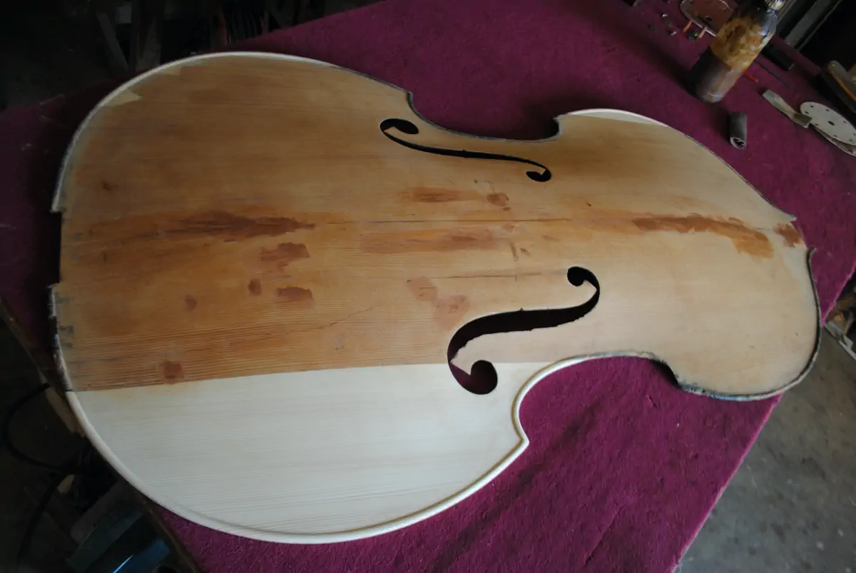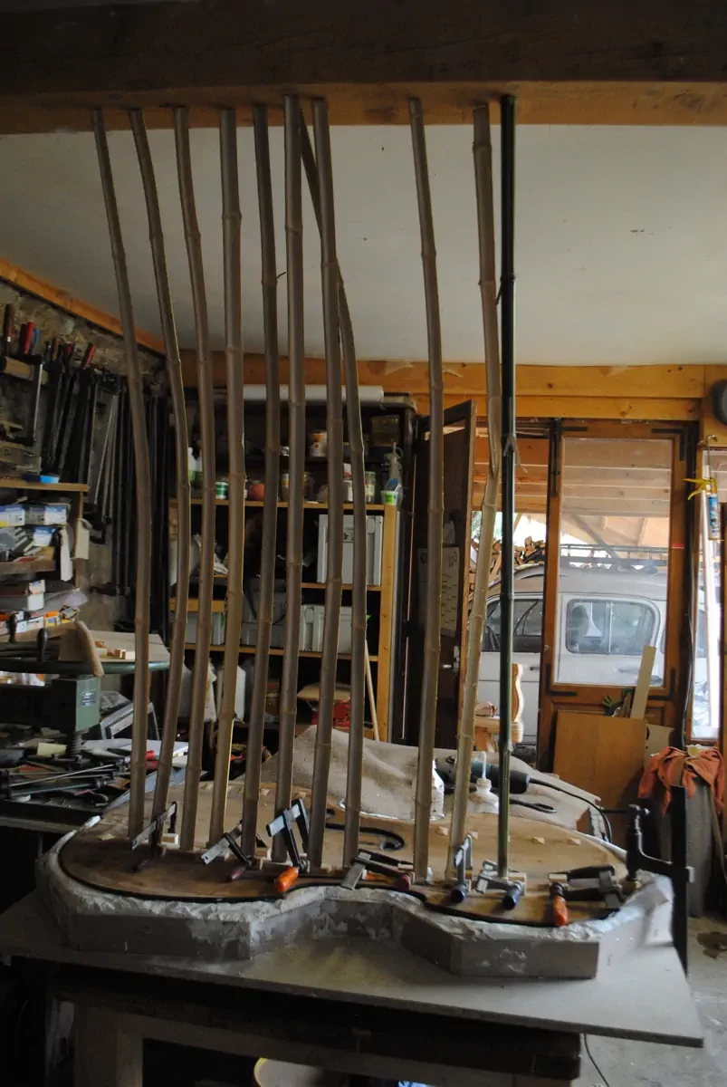 Mise sous presse de la table d'harmonie pour reformer sa courbe.