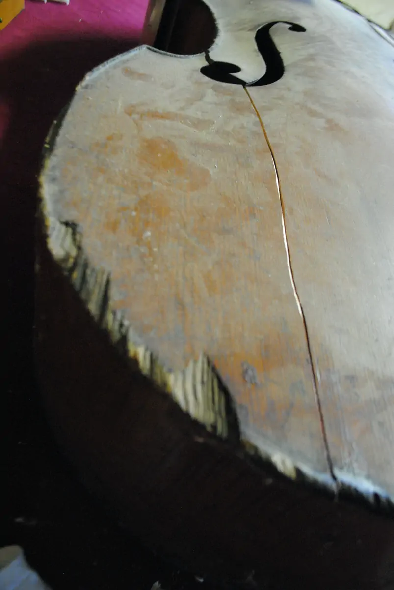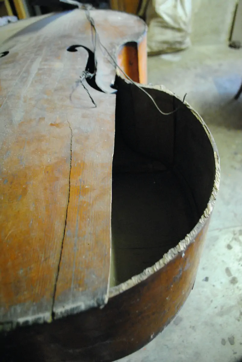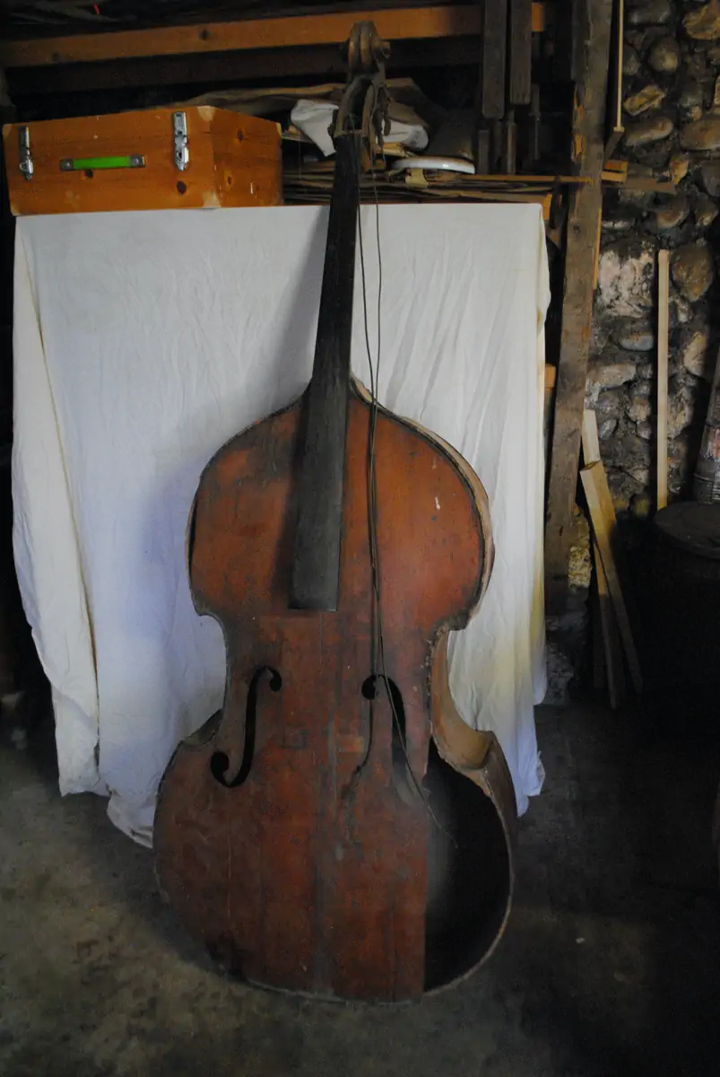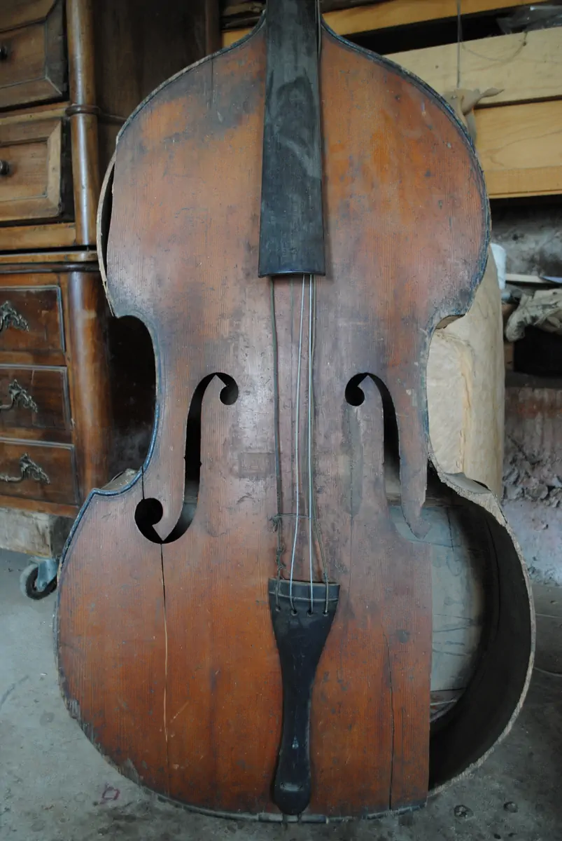 Accrochée au mur, cette contrebasse servait de cible à bouchons de champagne dans un conservatoire !