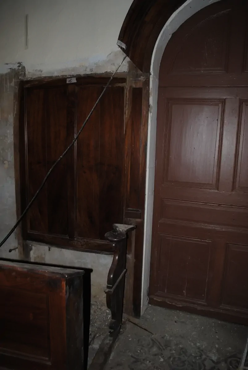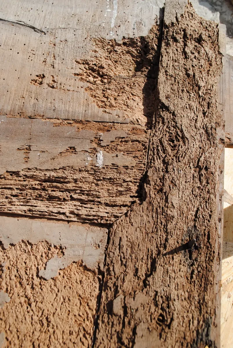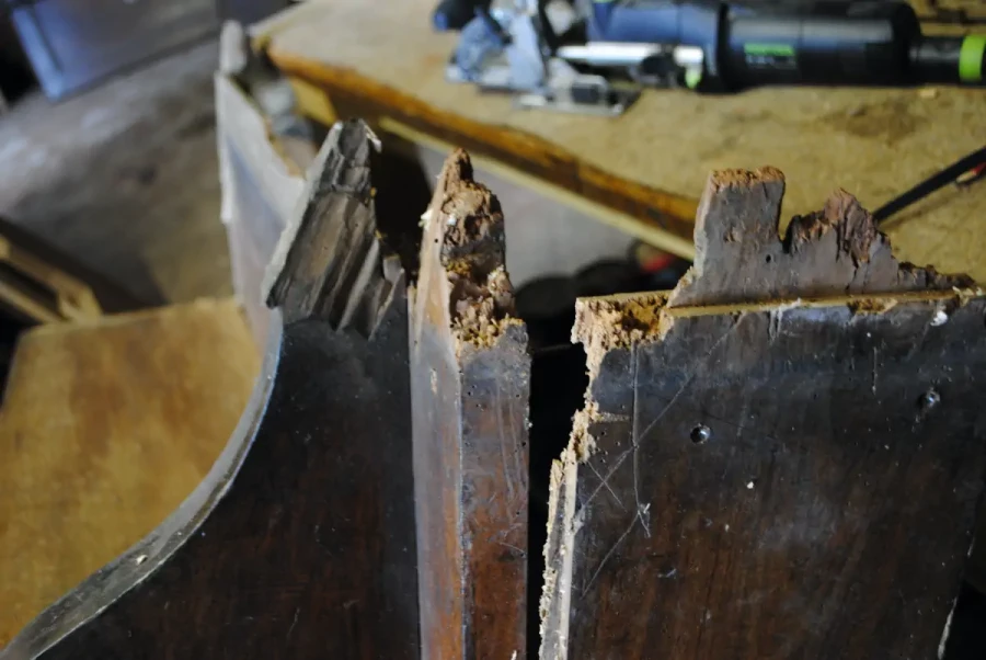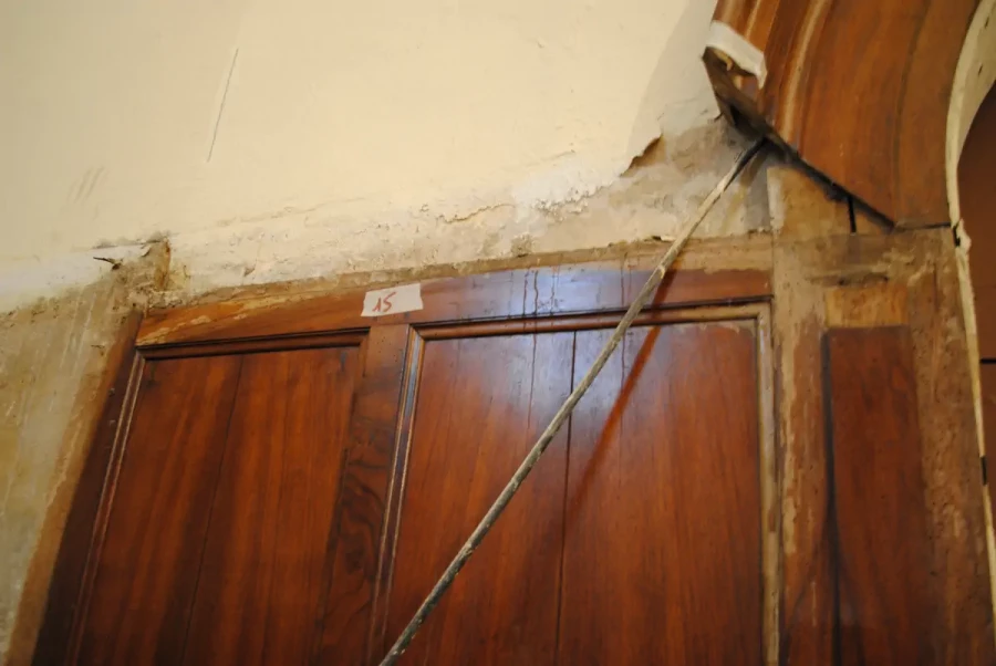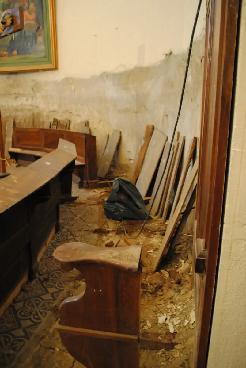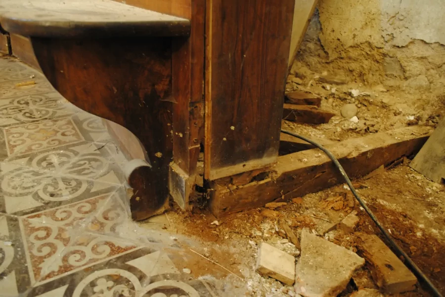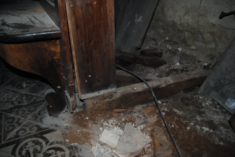 Etat initial : une fuite avaient favorisé la prolifération de la mérule (un champignon) dans les planchers en châtaignier et à la base de l'ensemble des boiseries en noyer. La vrillette (un insecte xylophage) avait également attaqué une grande partie des boiseries.