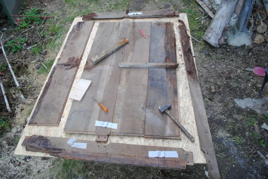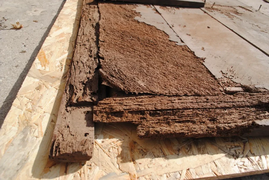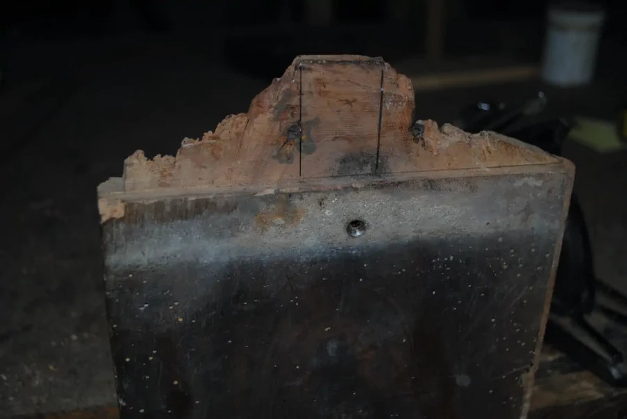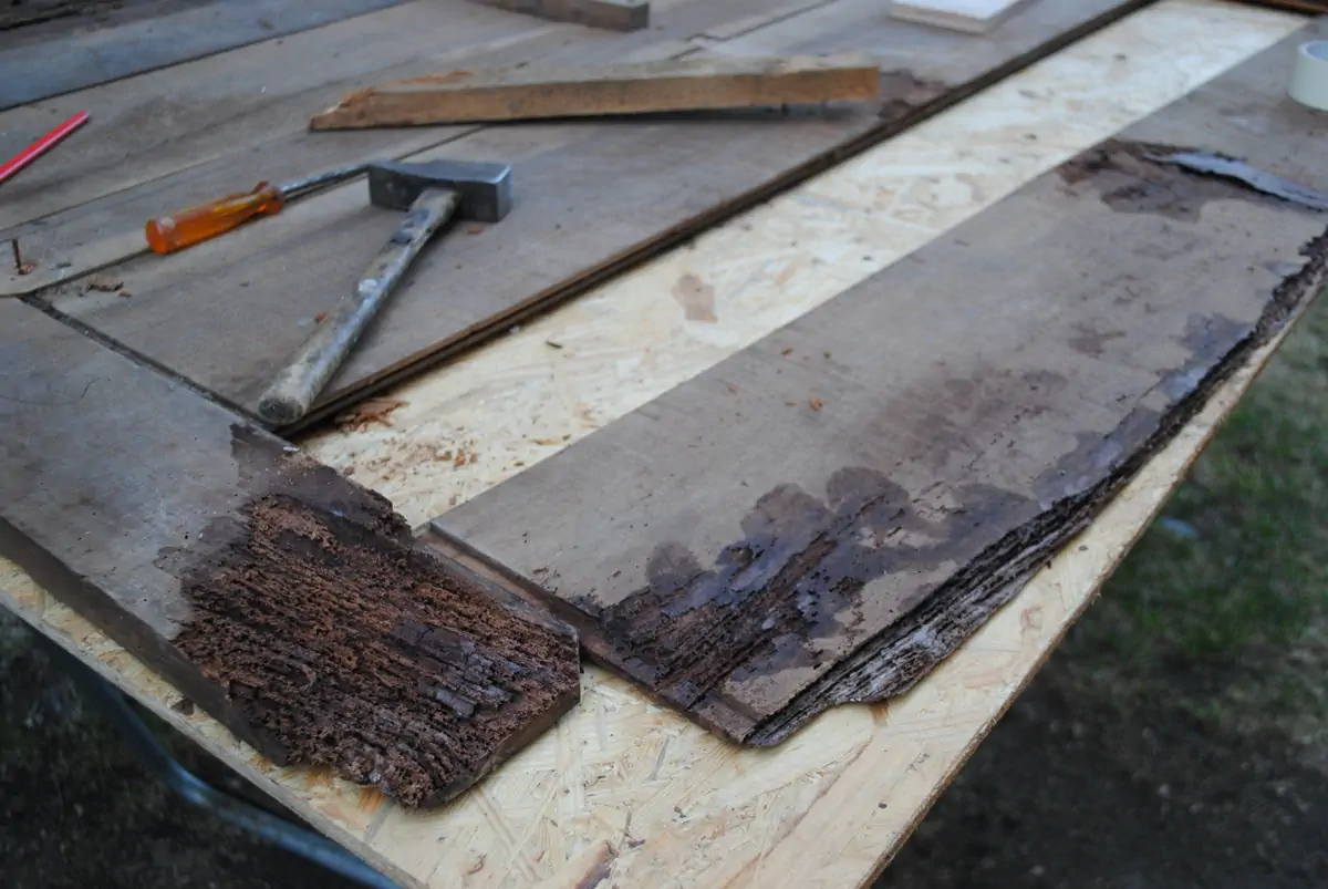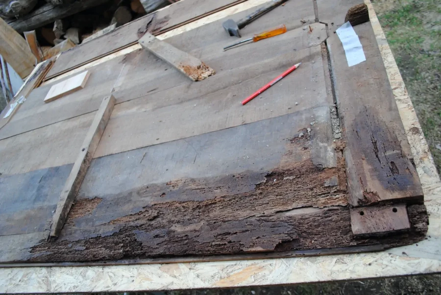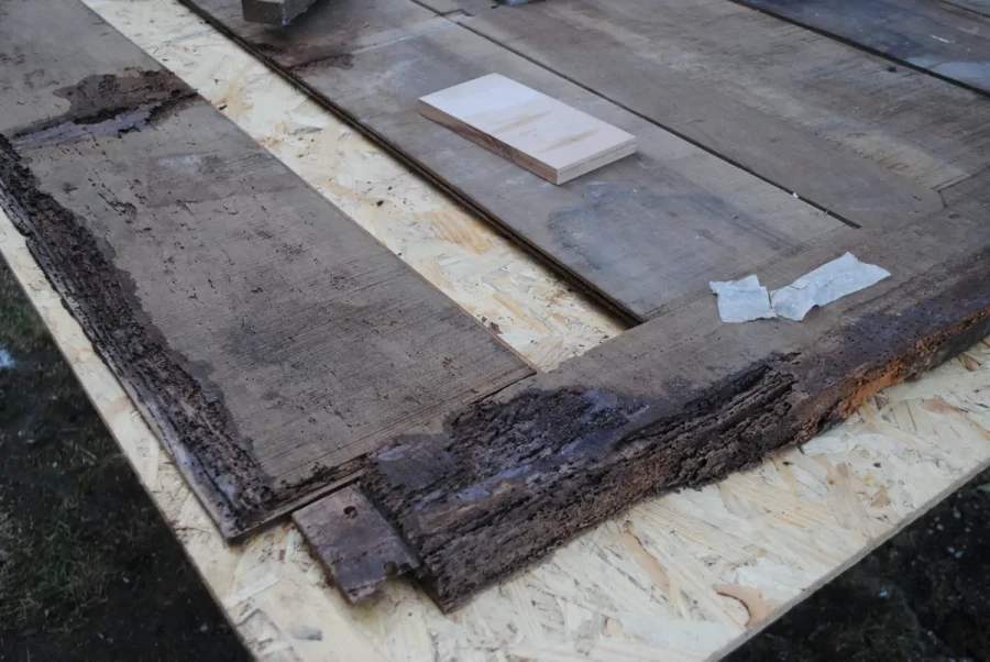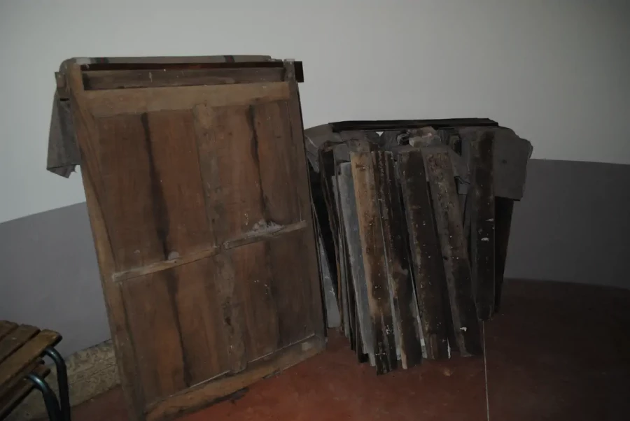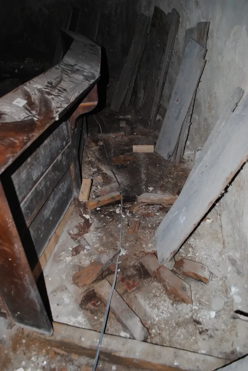 Etat initial : une fuite avaient favorisé la prolifération de la mérule (un champignon) dans les planchers en châtaignier et à la base de l'ensemble des boiseries en noyer. La vrillette (un insecte xylophage) avait également attaqué une grande partie des boiseries.