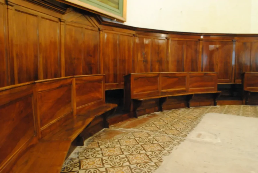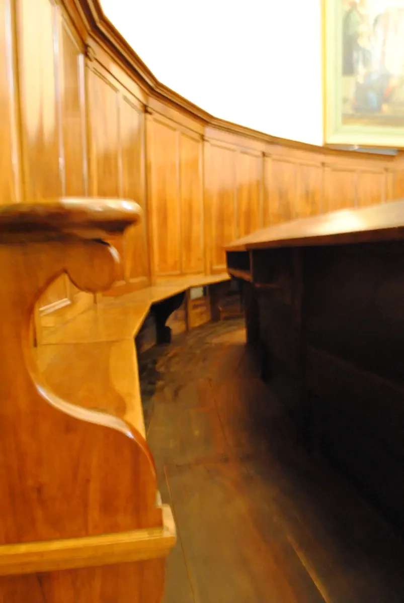 Le chantier : dépose complète des stalles avec les boiseries, restauration en atelier de l'ensemble des structures. Traitement insecticide et antifongique à base d'huiles essentielles (Biorox).